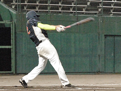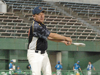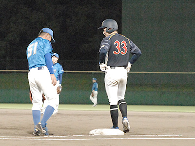 病院澤木監督はレフト前に打球をはじき返し、出塁します。