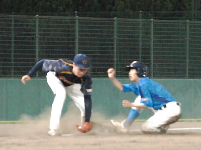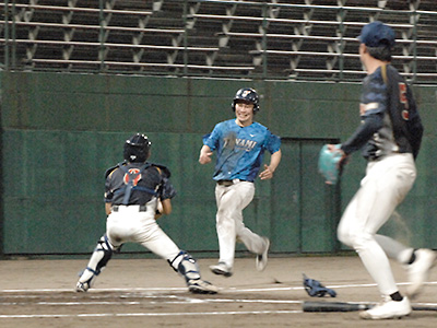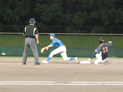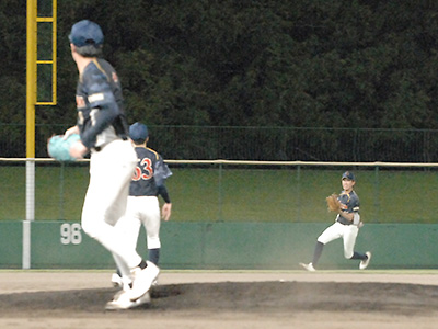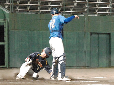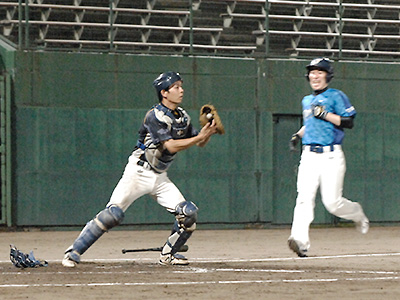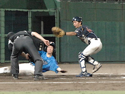 井田捕手がホームでタッチアウトにし、失点を阻止します。