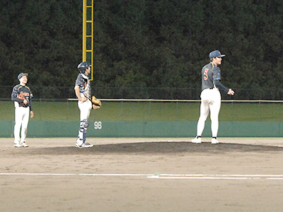 1塁もアウトとなり、ホーム併殺でピンチを脱しました。