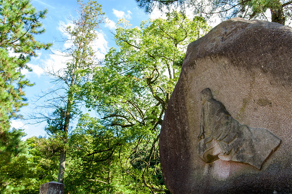 観光ガイド系のサイトでは、正面写真が多いですが、石碑のお松様は左側を向いておられます。