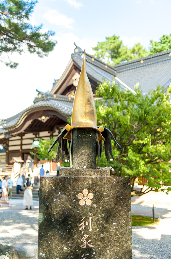 境内側に戻ってくると、利家公の兜を模したレプリカの兜がありました。