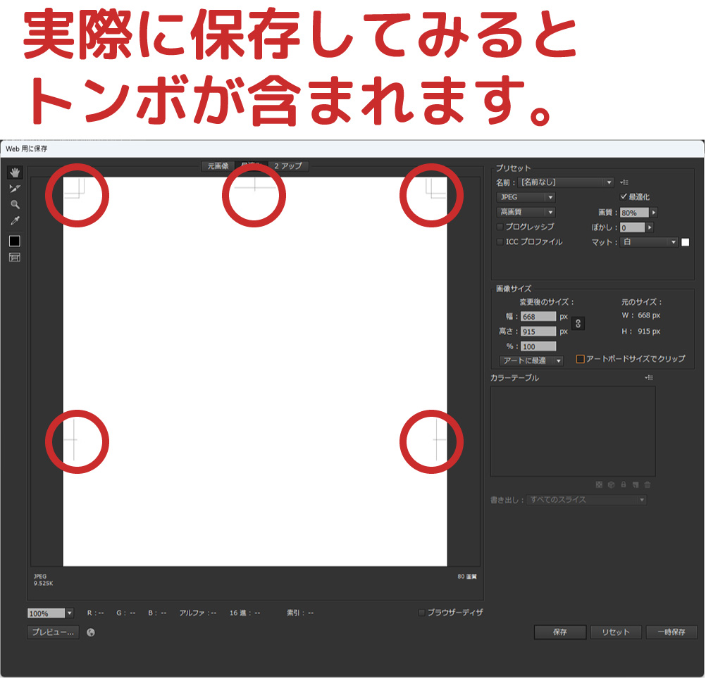 試しにそのまま画像保存すると、どうしてもトンボが含まれてしまいます。
