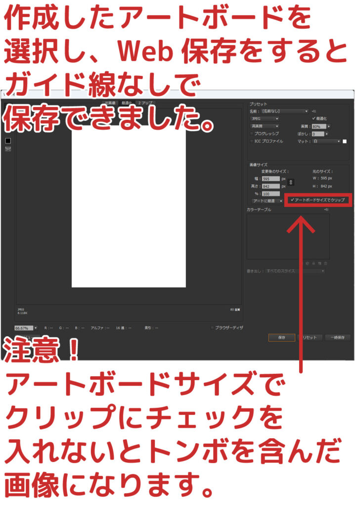 ガイド線を変換したアートボードを選択し、Web用保存をするとトンボなしで画像保存ができました。